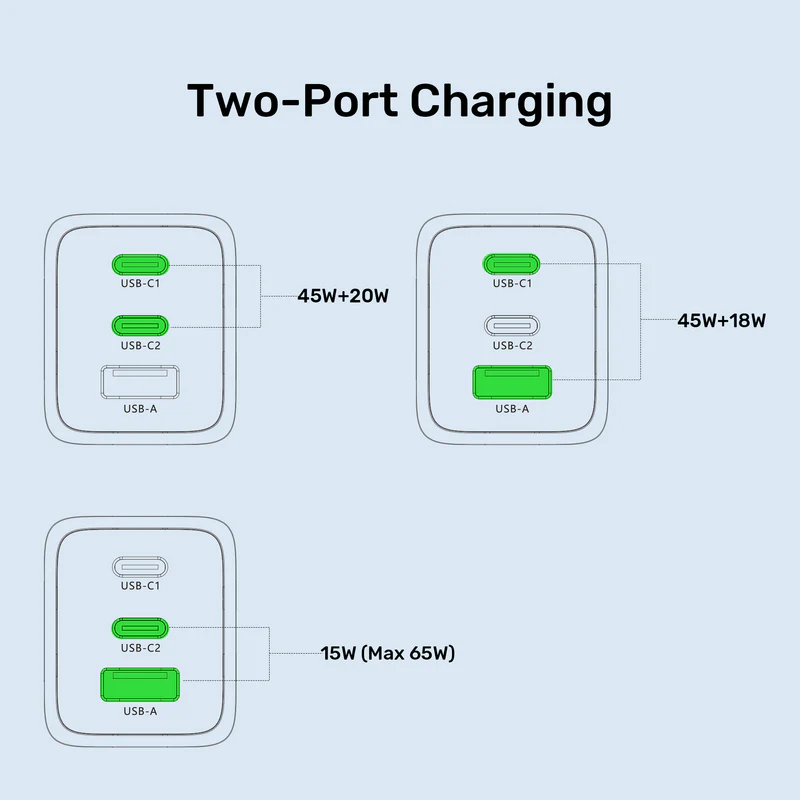 | Output khi sạc nhiều cổng | USB-C1 + USB-C2: 45W + 20W USB-C1 + USB-A: 45W + 18W USB-C2 + USB-A: 15W USB-C1 + USB-C2 + USB-A: 45W + 7.5W + 7.5W |