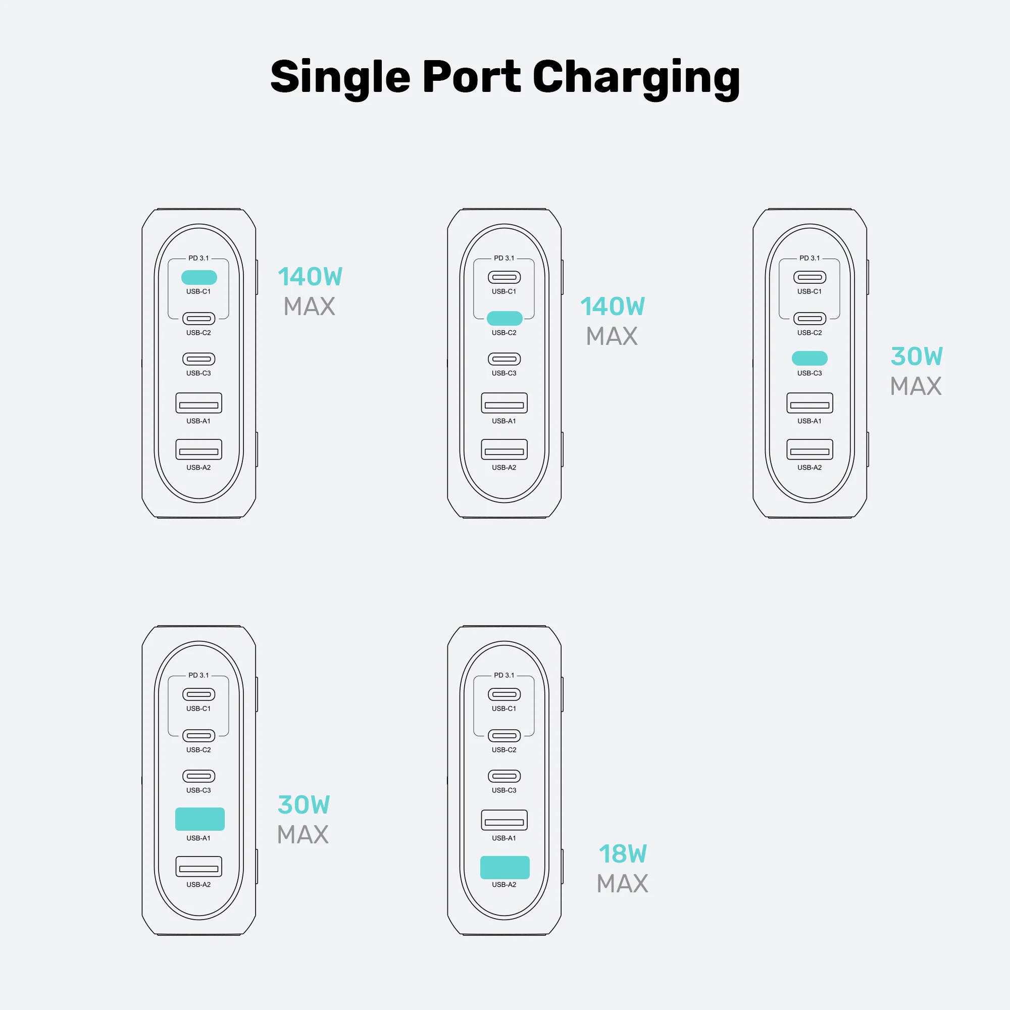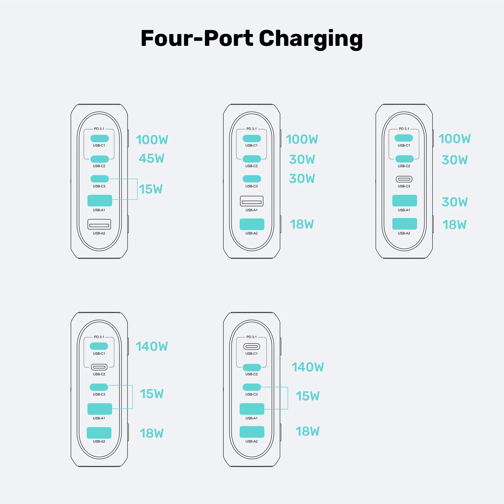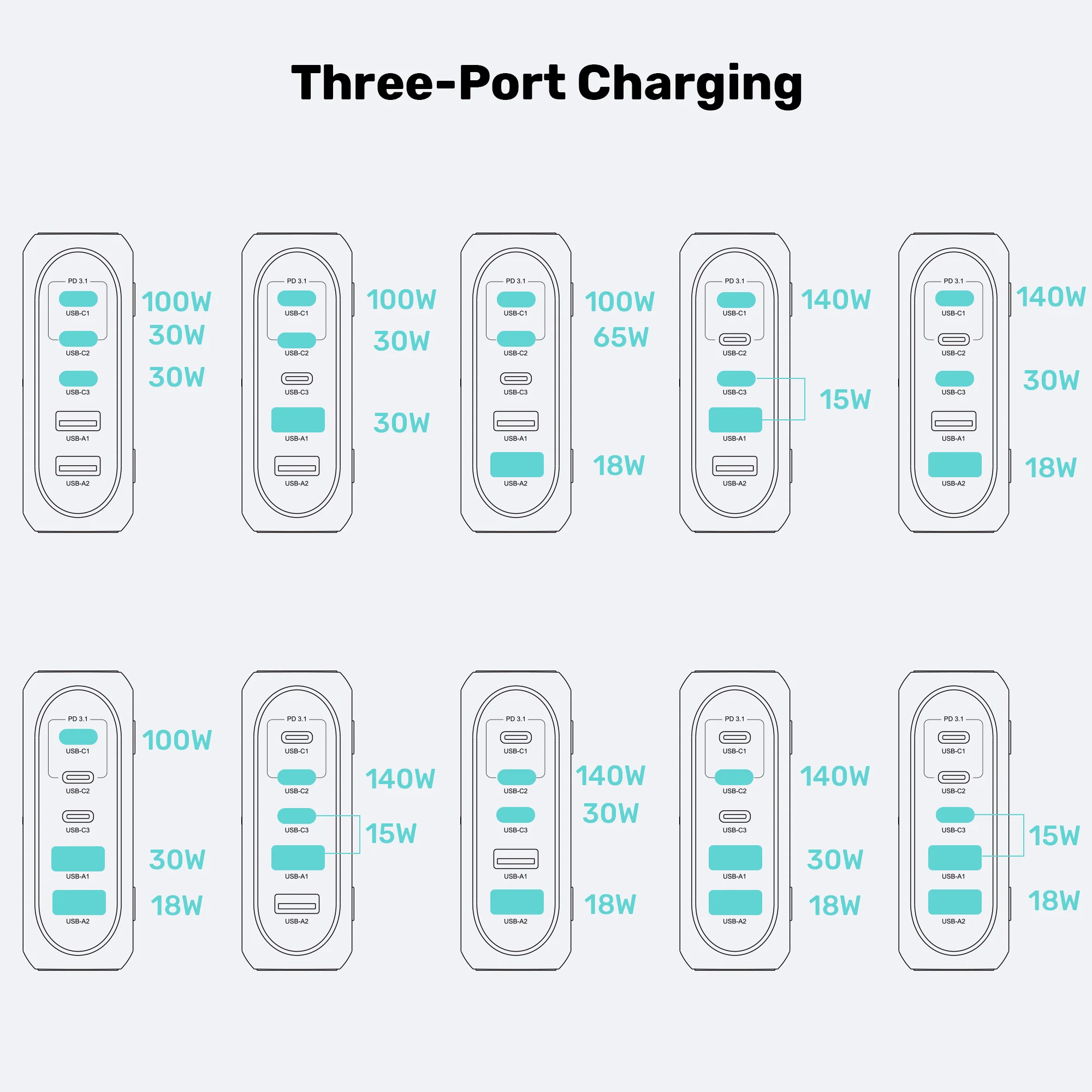 | Cổng ra | USB-A1: 30W max (5V=3A, 9V=3A, 12V=2.5A, 20V=1.5A) USB-A2: 18W max (5V=3A, 9V=2A, 12V=1.5A) USB-C1/C2: 140W max (5V=3A, 9V=3A, 12V=3A, 15V=3A, 20V=5A, 28V=5A) USB-C3: 33W max (5V=3A, 9V=3A, 12V=2.5A, 15V=2A, 20V=1.5A) Hỗ trợ nhiều tổ hợp chia tải (PD100W + PD65W, PD140W + PD30W, v.v...) |